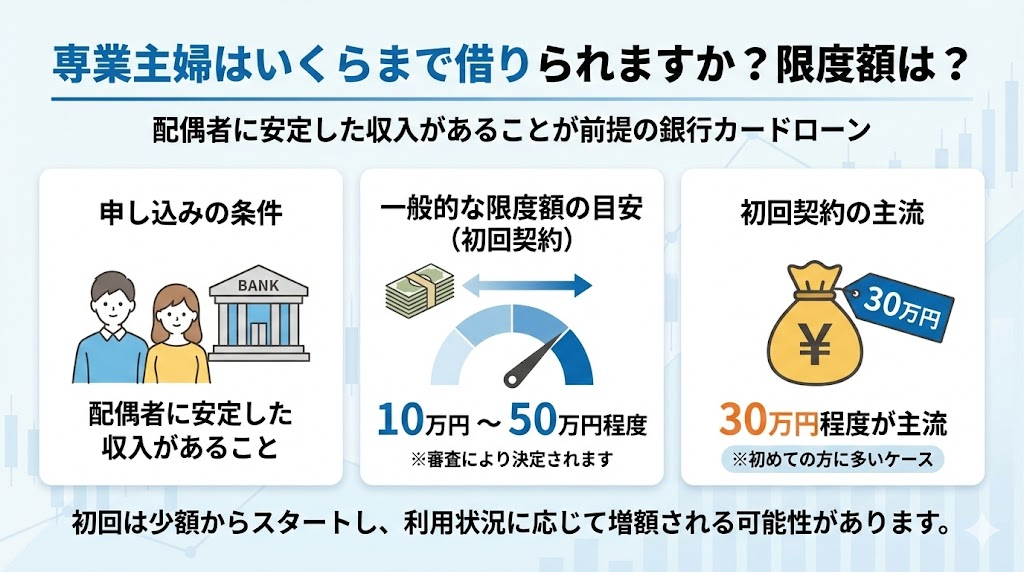 - 専業主婦の借入限度額は初回契約時30万円~50万円が一般的