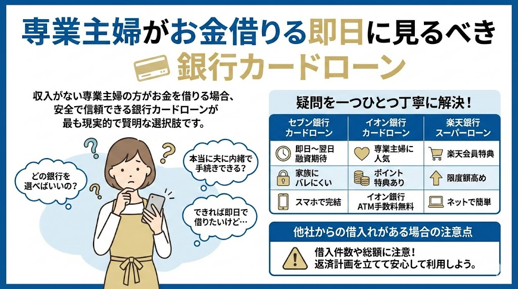 この記事では、そんな専業主婦の皆さんの切実な疑問にお答えします。セブン銀行カードローンやイオン銀行カードローン、楽天銀行カードローンなど、正規の金融機関が提供する安全な方法を中心に、専業主婦がお金を借りるための具体的な選択肢と、即日融資を実現するためのポイントを徹底解説します。
