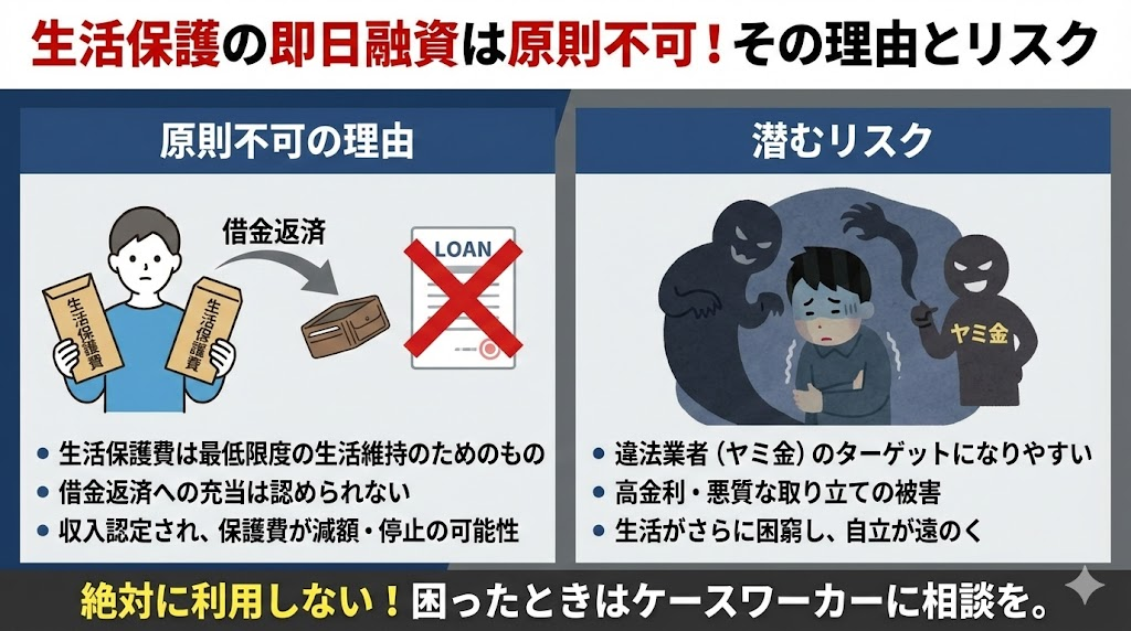 - 生活保護受給者が民間金融機関から即日融資を受けることはほぼ不可能