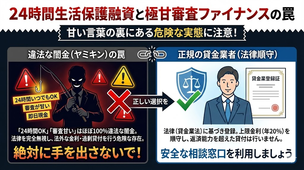 「24時間いつでもOK」「審査が甘い」といった言葉で生活保護受給者にお金を貸そうとする業者は、ほぼ100%が違法な闇金(ヤミキン)業者です。