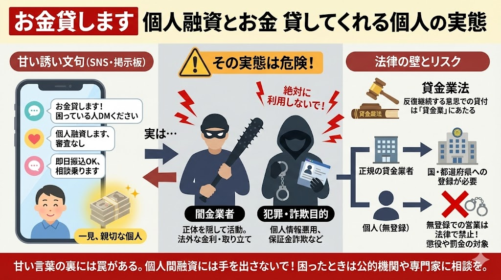 これらは一見、親切な個人がお金を貸してくれるように見えますが、その多くは闇金業者が正体を隠して活動しているか、別の犯罪を目的とした詐欺です。