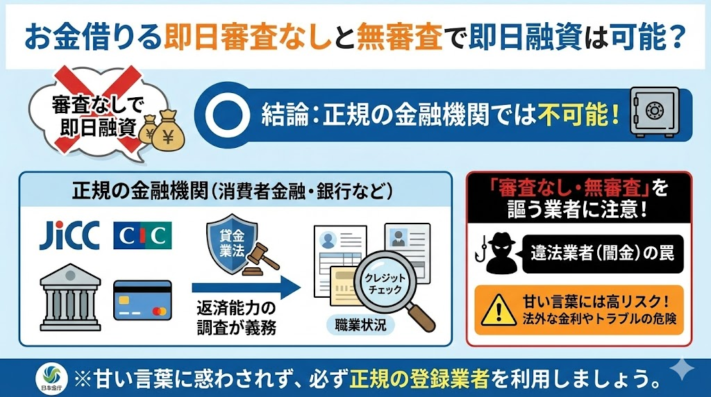 - 正規の貸金業者は法律で審査が義務付けられており無審査融資はあり得ない