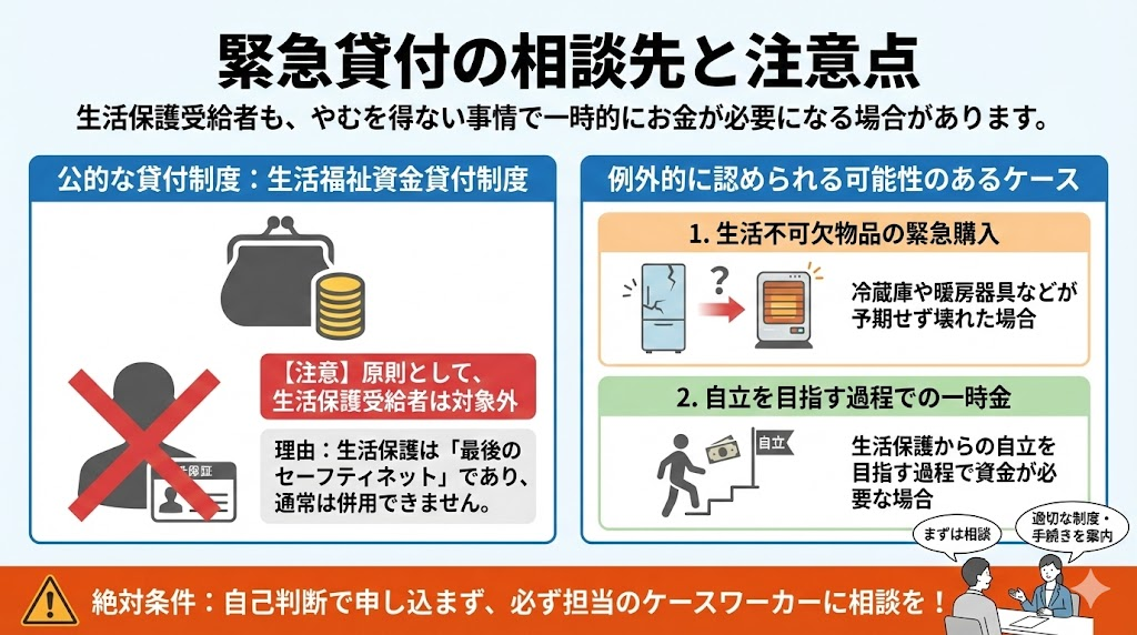 生活保護受給者であっても、やむを得ない事情で一時的にお金が必要になるケースはあります。そうした場合に検討できるのが、公的な貸付制度です。