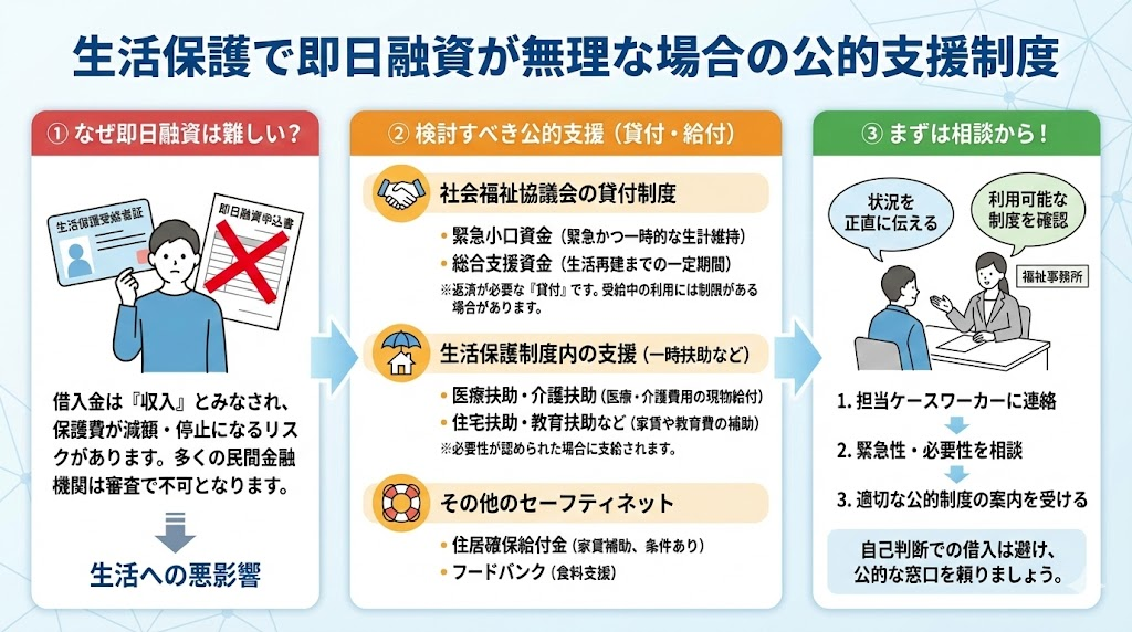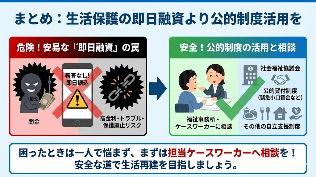 結論として、生活保護受給者が安全かつ合法的な方法で「即日融資」を受けることは、極めて困難です。