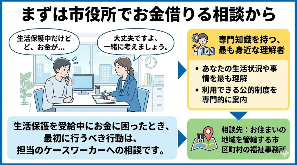 生活保護を受給中にお金に困ったとき、最初に行うべき行動は、担当のケースワーカーへの相談です。