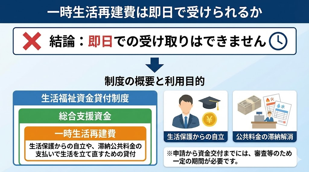 結論として、「一時生活再建費」を即日で受け取ることはできません。