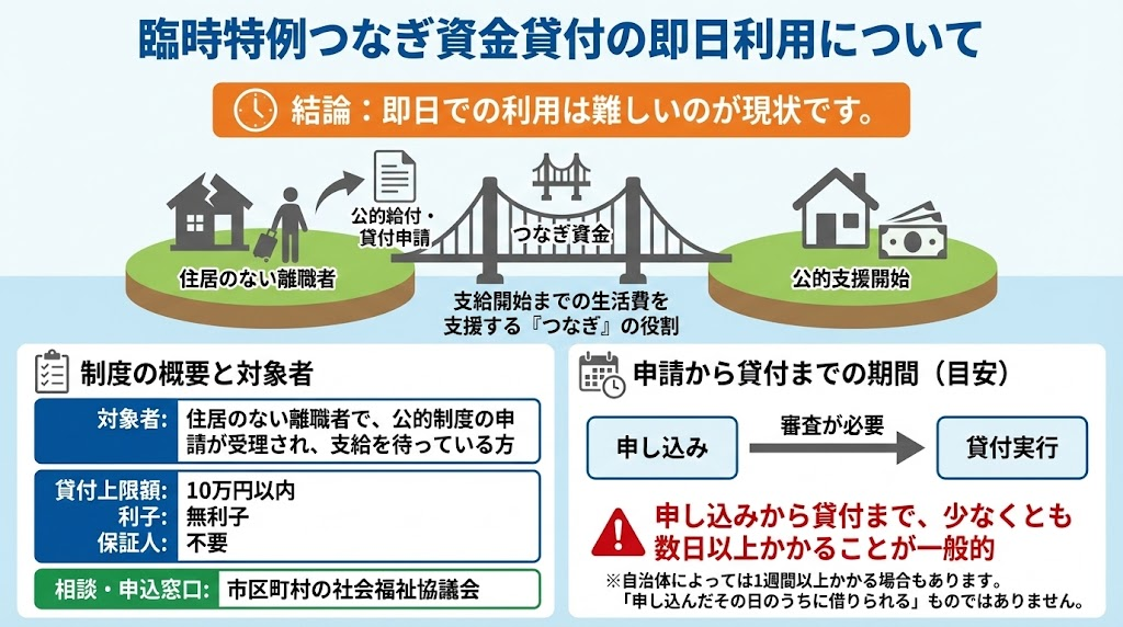 「臨時特例つなぎ資金貸付」も、即日での利用は難しいのが現状です。