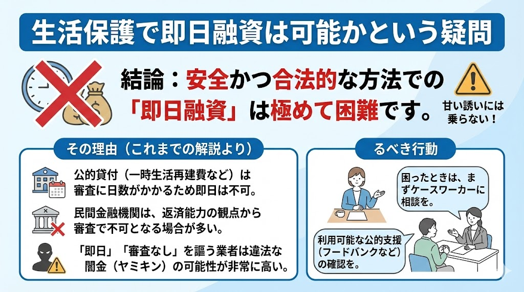 ここまで解説してきた内容を踏まえ、「生活保護で即日融資は可能か」という最初の疑問に改めてお答えします。