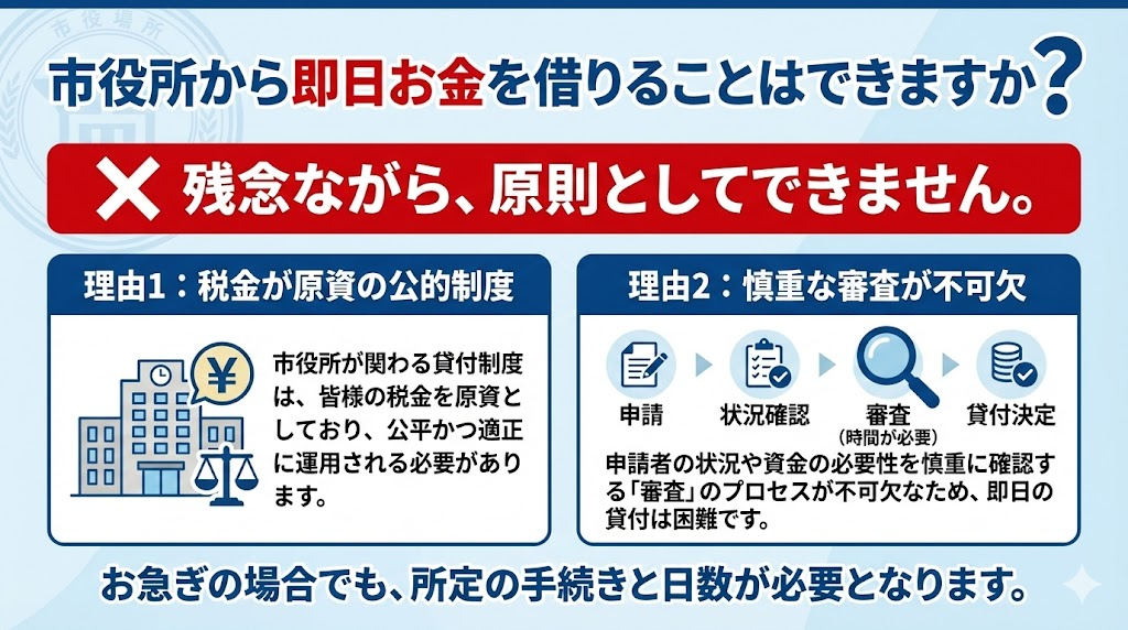 - 市役所の窓口でその日のうちにお金を借りることは原則として不可能である