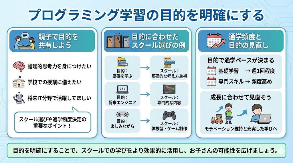 まず、お子さんがプログラミングを学ぶ目的をしっかりと考えることが大切です。プログラミング学習には、「論理的思考力を身につけたい」「学校での授業に備えたい」「将来IT分野で活躍してほしい」など、さまざまな目標があります。これを親子で話し合いながら共有することが、スクール選びや通学頻度の決定において重要なポイントになります。