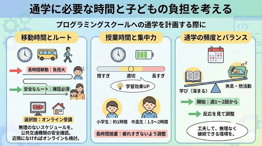 プログラミングスクールへの通学を計画する際には、移動時間や授業時間が子どもにどの程度の負担を与えるかを考慮することが重要です。特に、学校や他の習い事との両立を目指す場合、無理のないスケジュールを組むことが求められます。