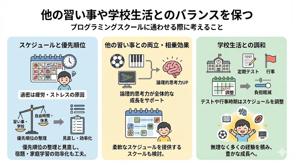 プログラミングスクールに通わせる場合、他の習い事や学校生活とのバランスをしっかりと考えることが必要です。子どもの学習意欲や体力には限界があるため、過剰なスケジュールを組むと疲労やストレスの原因になります。