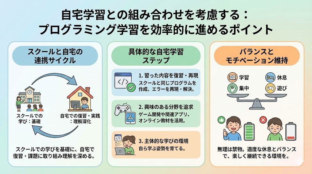 一方で、自宅学習を無理に取り入れすぎると、子どもが疲れてしまい、スクール通いへのモチベーションも低下する可能性があります。適度な休息とバランスを取りながら、子どもが楽しく学べるよう配慮することが重要です。