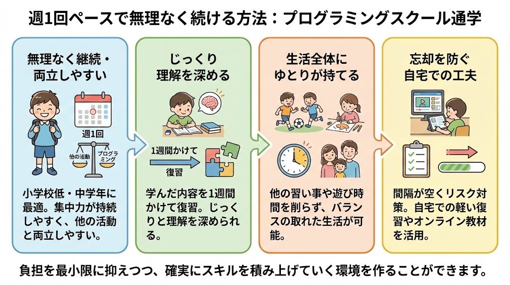さらに、週1回ペースで通うことで、子どもの生活全体にゆとりを持たせることができます。他の習い事や友達との遊び時間を削ることなく、バランスの取れた生活を送ることが可能です。特に、他の活動を大切にしながらプログラミングを学びたい家庭には、この方法が適しています。