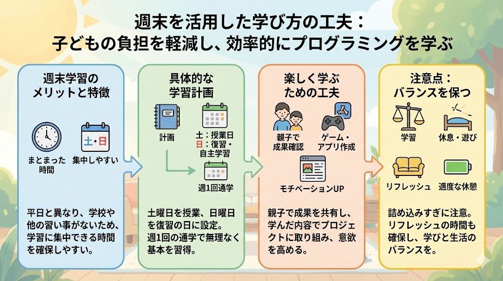 週末を利用してプログラミングを学ぶ方法は、子どもの負担を軽減しながら効率的にスキルを身につける優れた選択肢です。週末は平日と異なり学校や他の習い事がない場合が多く、まとまった時間を確保できるため、学習に集中しやすい環境を整えやすいのが特徴です。