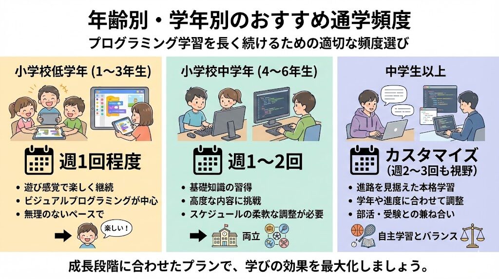 子どもの年齢や学年に応じた適切な通学頻度を選ぶことは、プログラミング学習を長く続けるための重要な要素です。成長段階に合わせたプランを考えることで、学びの効果を最大化できます。