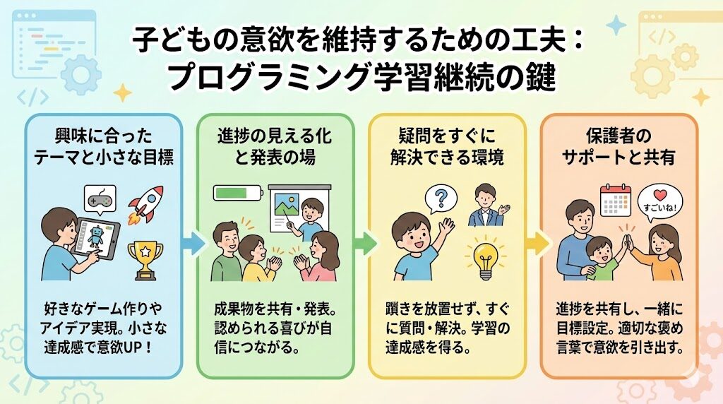 最後に、保護者のサポートも忘れてはいけません。進捗を共有し、一緒に目標を立てることで、子どもにとってプログラミングが家族全体の関心事となり、モチベーションを維持しやすくなります。適切な褒め言葉をかけることで、さらに学習への意欲を引き出すことができます。