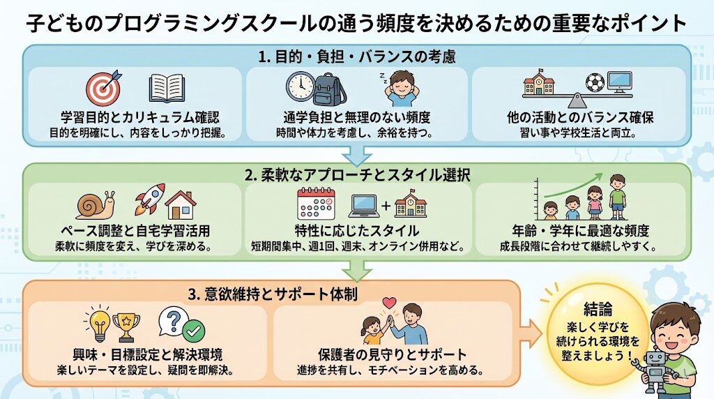 子どもがプログラミングスクールに通う際、どのくらいの頻度が適切かを決めることは重要です。学びを効果的にするためには、子どもの年齢や目的、生活スタイルを考慮する必要があります。ここでは、通学頻度を決めるための具体的なポイントについて解説します。