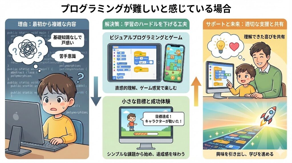 親や教師も、子どもが難しさを感じている箇所を見極めて適切なサポートを提供することが大切です。理解できたときの喜びを共有することで、プログラミングへの興味を引き出すきっかけとなるでしょう。