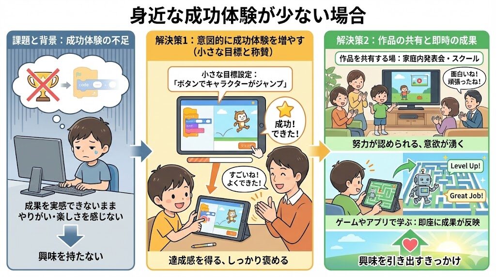 子どもがプログラミングに興味を持たない背景には、成功体験が不足していることが挙げられます。成果を実感できないまま学び続けると、やりがいや楽しさを感じられなくなる可能性があります。この問題を解消するためには、意図的に成功体験を増やす工夫が必要です。