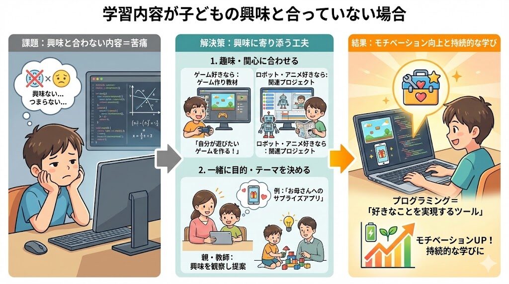 子どもがプログラミングに興味を示さない理由として、学習内容が本人の関心と合っていない場合が考えられます。興味のない課題に取り組むことは、子どもにとって苦痛に感じられることが多いため、内容を子どもの趣味や興味に合わせる工夫が求められます。