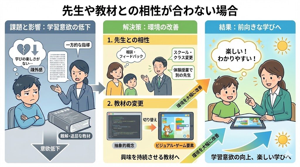 プログラミングを学ぶ上で、先生や教材との相性が合わないことは、子どもの学習意欲を大きく左右します。特に、初めてプログラミングに触れる子どもにとっては、指導者や教材が「学びの楽しさ」を感じさせてくれるかが重要です。