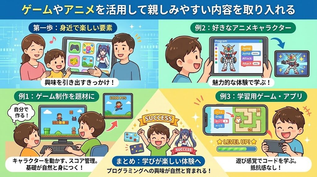 子どもがプログラミングに親しむための第一歩として、ゲームやアニメを学習に取り入れることは非常に効果的です。これらは子どもにとって身近で楽しい要素であり、学びへの興味を引き出すきっかけとなります。
