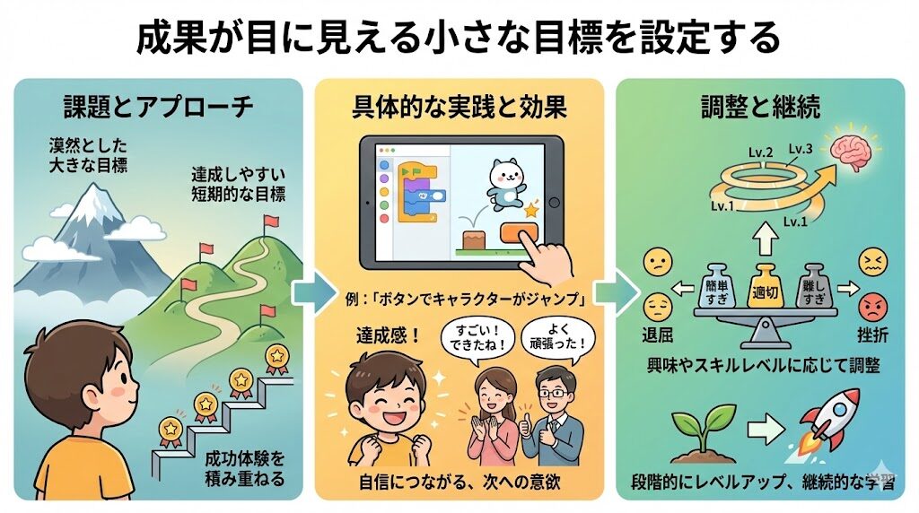 子どもがプログラミングに取り組む際、成果が目に見える形で現れる小さな目標を設定することが、モチベーションの向上につながります。漠然とした大きな目標ではなく、達成しやすい短期的な目標を設定することで、成功体験を積み重ねることができます。