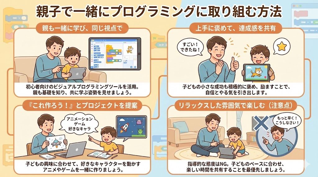 まずは、親が簡単なプログラミングの基礎を学び、子どもと同じ視点で取り組む姿勢を見せることが重要です。特にビジュアルプログラミングツールのような初心者向けの教材を選ぶと、親子ともに取り組みやすくなります。また、親が上手に子どもの成果を褒めたり励ましたりすることで、達成感を得られる機会を増やせます。