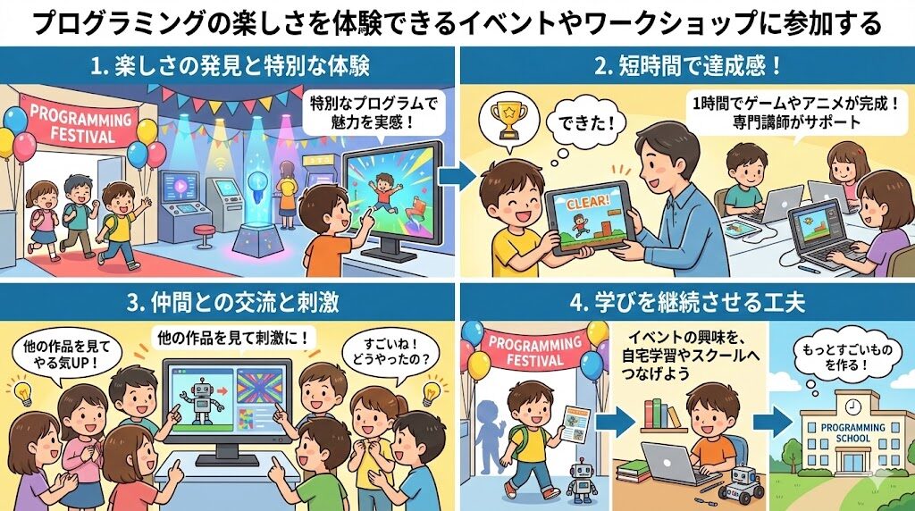 - プログラミングの楽しさを体験できるイベントやワークショップに参加する