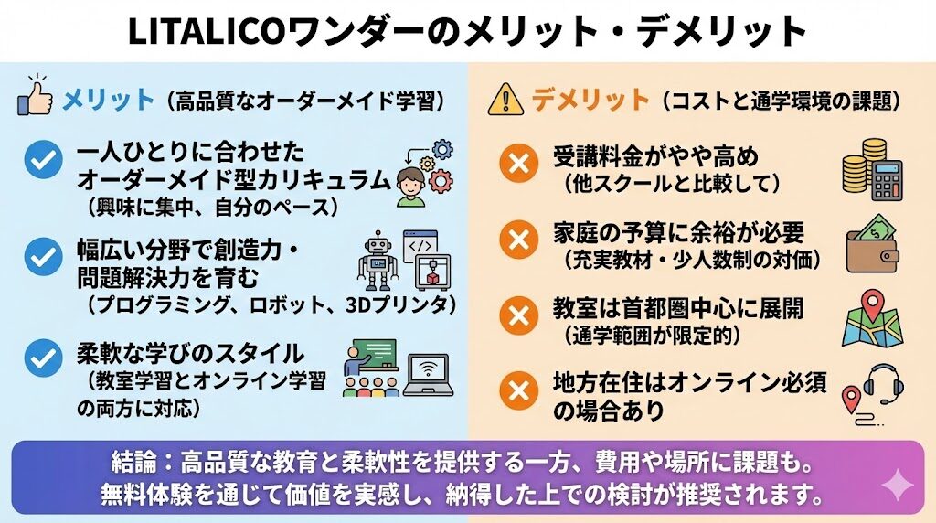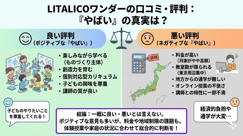 以上のように、LITALICOワンダーの口コミ・評判は一概に「良い」「悪い」と結論づけることはできませんが、多くのポジティブな意見がある一方で、料金や地域制限に関する課題があると言えます。口コミを参考にする際は、自分の家庭の状況やお子さんの希望に照らし合わせて、総合的に判断することが大切です。