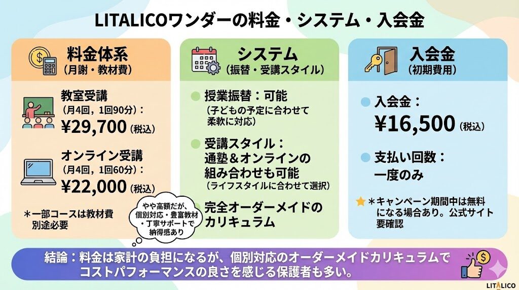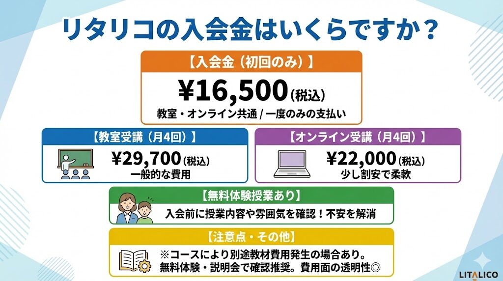 リタリコワンダーに入会する際の入会金は16,500円(税込)となっています。この入会金は、教室受講でもオンライン受講でも共通で発生する費用です。一度支払えば、追加で同じ金額を請求されることはなく、初回のみの費用として安心して利用することができます。