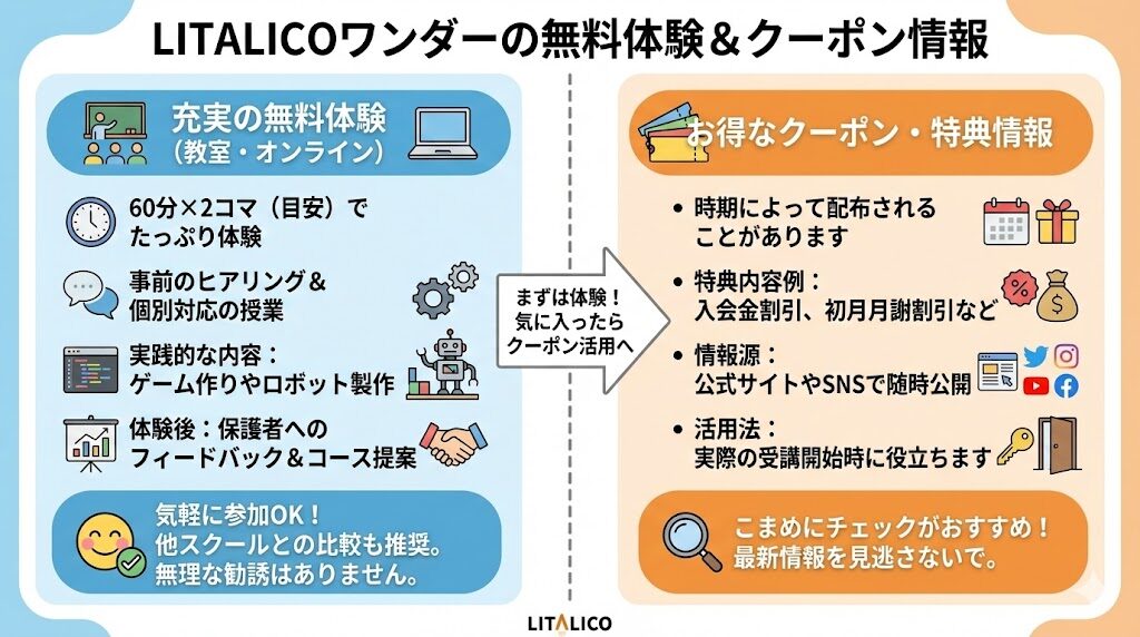 LITALICOワンダーでは、初めての方でも気軽に授業を体験できるよう、無料体験の機会が設けられています。この無料体験は、教室受講とオンライン受講のどちらでも可能で、60分の授業を2コマ受けられる場合が多いです。参加前にお子さんの興味や目標についてヒアリングがあり、個別対応の授業が体験できる点が大きな魅力です。