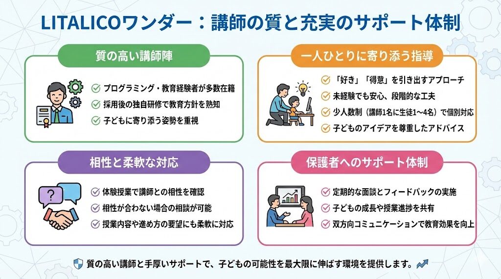 LITALICOワンダーの講師陣は、子ども一人ひとりに寄り添った指導を心がけており、その質の高さが特徴です。講師には、プログラミングや教育分野の経験者が多く在籍しており、採用後には独自の研修プログラムを受けることで、LITALICOワンダーの教育方針を十分に理解した上で授業を担当しています。