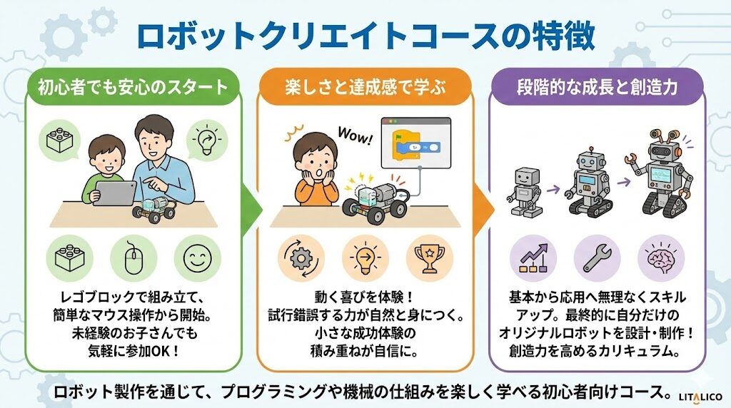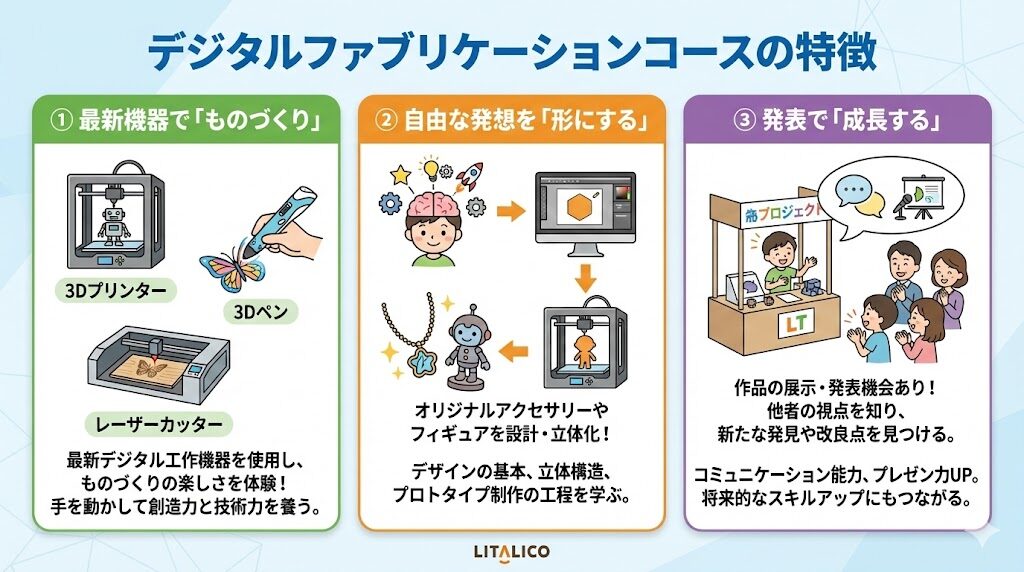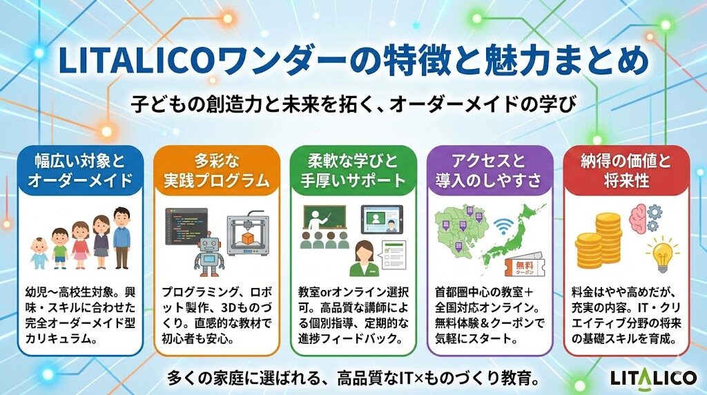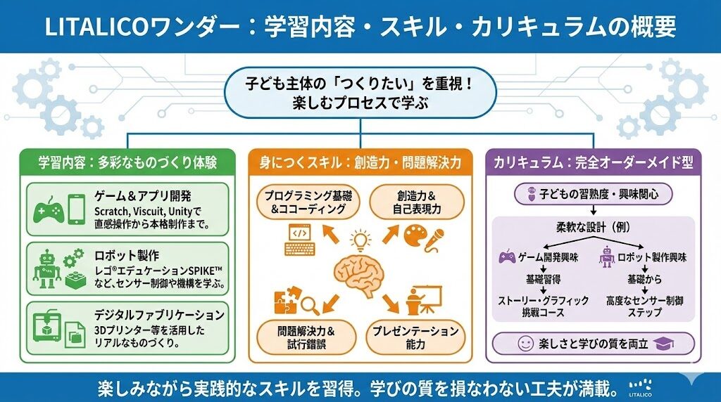 LITALICOワンダーは、子どもの「好き」や「得意」を引き出す個別対応型のプログラミング教室です。ゲームやロボット製作、デジタルファブリケーションを通じて、創造力や論理的思考力を育むことを目的としています。