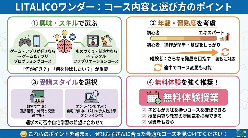 LITALICOワンダーでは、子ども一人ひとりの興味やスキルに合わせた多彩なコースが用意されています。コースを選ぶ際には、まずお子さんが何に興味を持っているか、またどのようなスキルを伸ばしたいかを考えることが重要です。例えば、ゲームが好きなお子さんであれば「ゲーム&アプリプログラミングコース」がおすすめですし、ものづくりが好きで創造力を育てたい場合は「デジタルファブリケーションコース」が適しています。