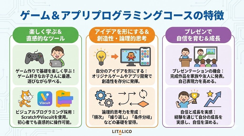 このコースの特徴は、ただプログラムを学ぶだけではなく、自分自身のアイデアを形にできる点です。例えば、「オリジナルのキャラクターが登場するゲームを作りたい」「スマホで動かせるアプリを開発したい」など、子どもたちの創造性を存分に発揮できる内容が用意されています。また、プログラミングの基礎となる「順次処理」「繰り返し」「条件分岐」などを学ぶことで、論理的思考力も育成されます。