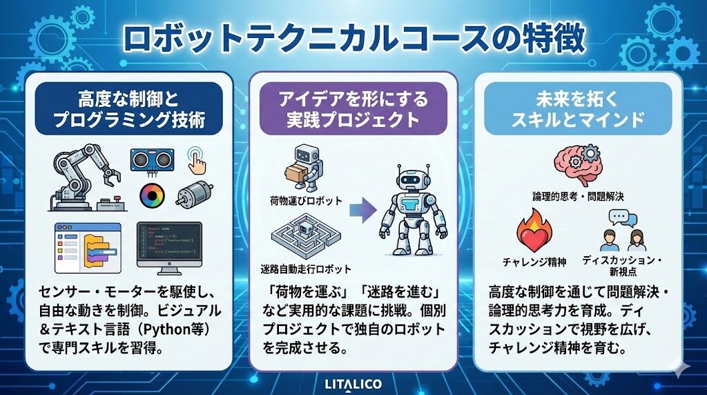 ロボットテクニカルコースは、より高度なロボット構造やプログラミングに挑戦したいお子さん向けのコースです。このコースでは、センサーやモーターを活用し、ロボットの動きを自由に制御する技術を学びます。プログラミングには、ビジュアルプログラミングツールだけでなく、Pythonなどのテキストベースのプログラミング言語も取り入れられており、より専門的なスキルを身につけることができます。