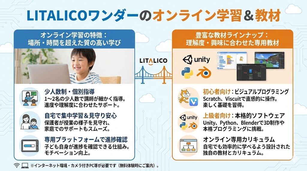 LITALICOワンダーのオンライン学習は、場所や時間に制約がある家庭や、教室に通学できない子どもたちにとって非常に魅力的な選択肢です。このオンライン学習は、専用の教材とサポート体制を通じて、教室学習と変わらない質の高い学びを提供しています。