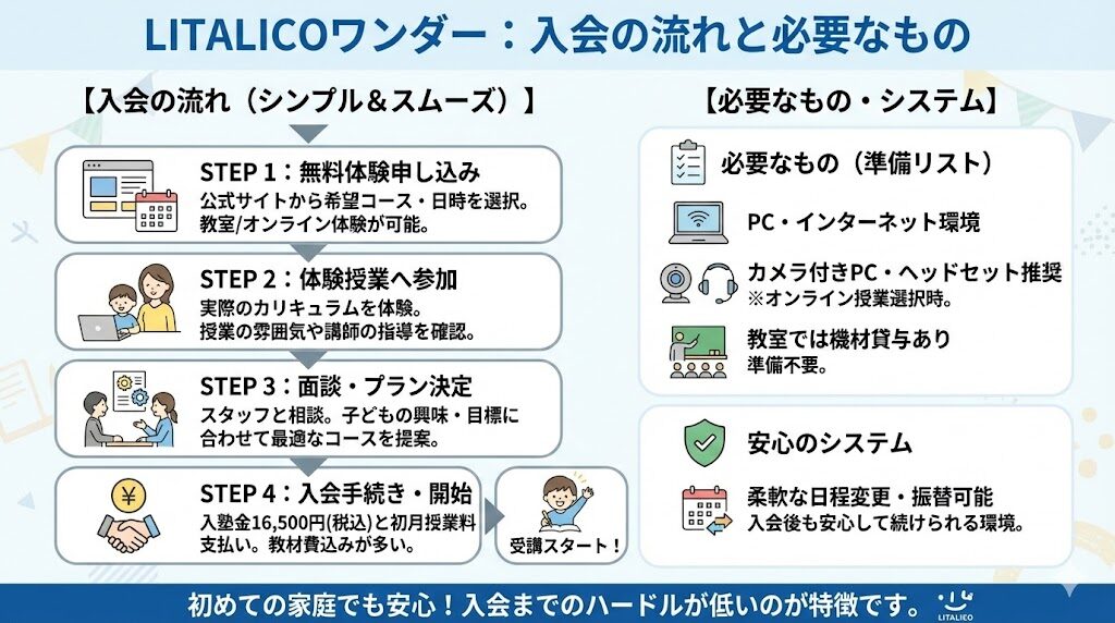 LITALICOワンダーへの入会はシンプルでスムーズな手順が用意されています。初めての方でも迷うことなく手続きを進めることができるよう、無料体験から始まるプロセスが特徴です。
