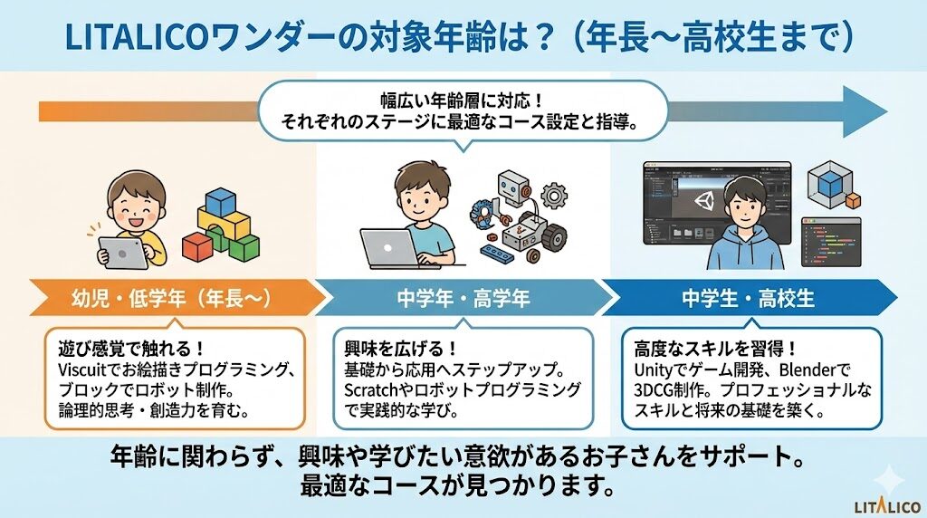 リタリコワンダーは、幼児から高校生まで幅広い年齢層を対象とした教育プログラムを提供しています。具体的には、幼稚園年長から高校生までのお子さんが受講可能で、年齢に応じたコース設定と指導が特徴です。この柔軟な対応範囲により、テクノロジーに早期から触れることを希望するご家庭や、高度なスキルを目指す中高生まで、それぞれの学習ニーズに応えることができます。