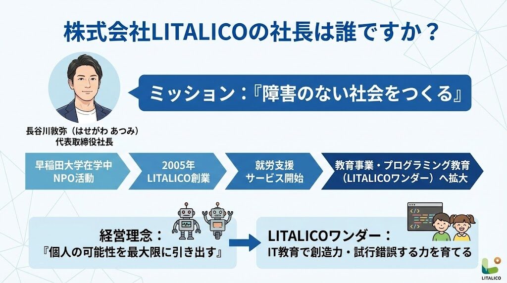 株式会社LITALICOの社長は、長谷川敦弥氏です。同社は「障害のない社会をつくる」というミッションのもと、教育や福祉に関わる事業を展開しています。長谷川氏は、LITALICOを設立した際に、社会課題をビジネスで解決することを目指し、特に教育や就労支援の分野で多くの実績を築いてきました。