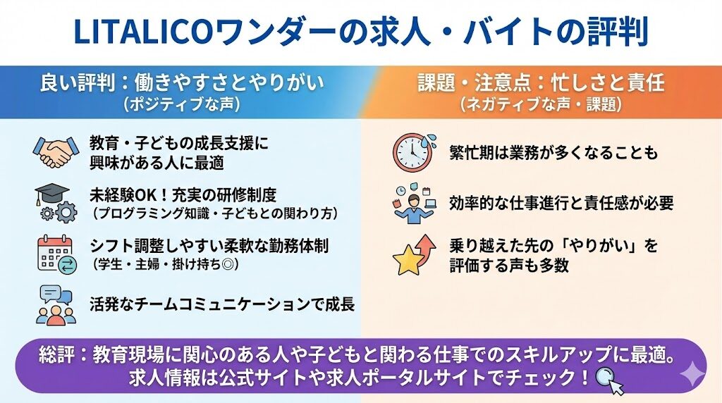 LITALICOワンダーの求人やバイトに関する評判は、主に「働きやすい環境」と「やりがいのある仕事」に注目が集まっています。教育や子どもの成長を支援する仕事に興味のある方にとって、特に魅力的な職場といえるでしょう。