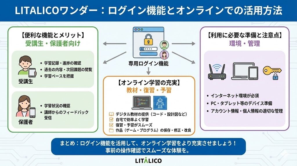 LITALICOワンダーのオンラインサービスには、専用のログイン機能が用意されており、これを活用することで受講生や保護者がよりスムーズに学習を進めることができます。オンライン学習が進化している現在、この機能はLITALICOワンダーの利用者にとって大変便利です。