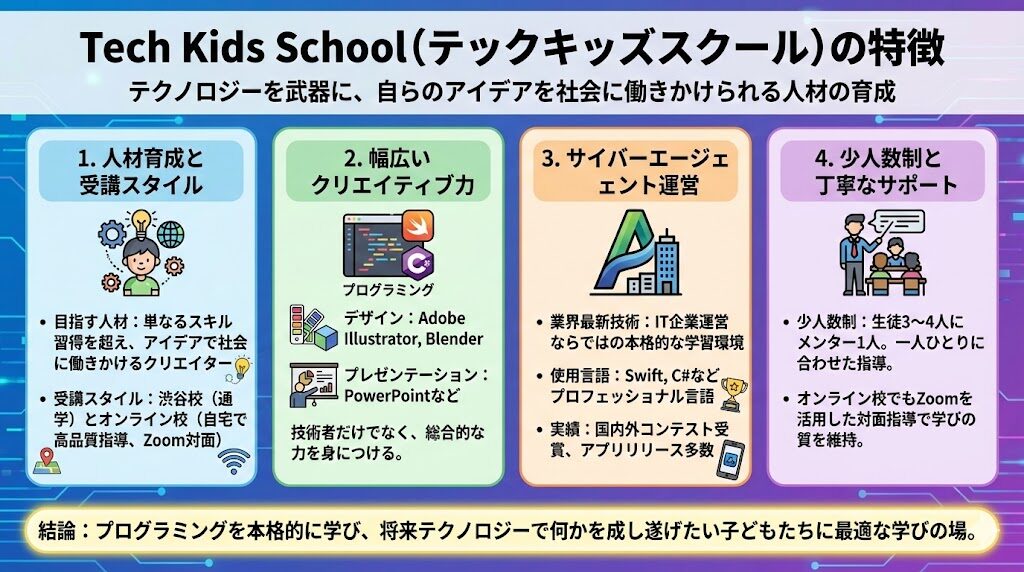 Tech Kids School(テックキッズスクール)は、小学生から中学生を対象とした日本最大級のプログラミングスクールです。その特徴は、単なるプログラミングの知識やスキルの習得にとどまらず、「テクノロジーを武器に、自らのアイデアを社会に働きかけられる人材の育成」を目指している点にあります。教室は渋谷校とオンライン校の2種類があり、通学が難しい場合でも自宅で高品質な指導を受けることができます。