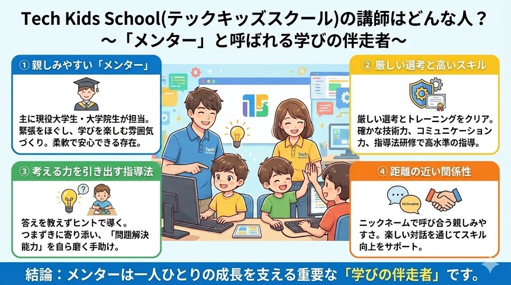 このように、Tech Kids Schoolの講師は「学びの伴走者」として、子どもたち一人ひとりの成長を支える重要な役割を担っています。