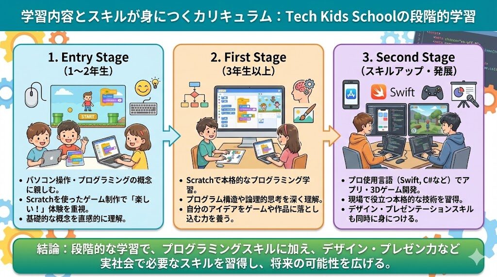 Tech Kids Schoolでは、子どもたちの学年や習熟度に応じたステージ制のカリキュラムを採用しています。このカリキュラムは、パソコン初心者から本格的なゲームやアプリ開発ができるレベルまで段階的にスキルを伸ばせるよう設計されています。