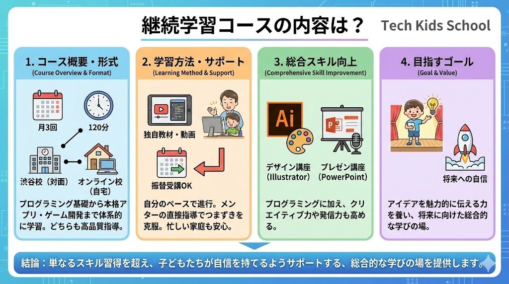 Tech Kids Schoolの継続学習コースは、月3回、1回120分の授業で構成されています。このコースでは、プログラミングの基礎から本格的なアプリ・ゲーム開発までを体系的に学習できます。教室は渋谷校とオンライン校から選べ、どちらでも同じ質の高い指導を受けられるのが特徴です。