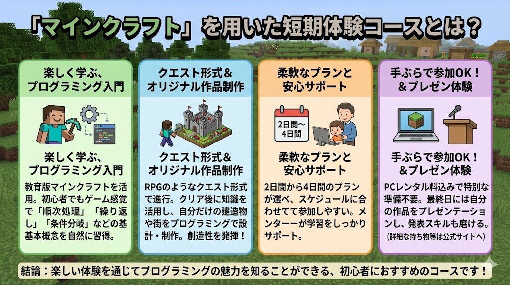 「マインクラフト」を用いた短期体験コースは、人気のサンドボックスゲーム「マインクラフト」を教材として活用しながらプログラミングを学ぶ特別な体験コースです。このコースは、プログラミング初心者の子どもたちでも楽しみながら知識を身につけられることを目的に設計されています。