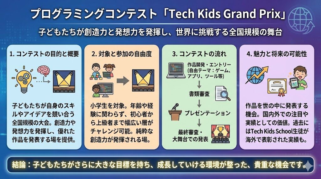 「Tech Kids Grand Prix」は、子どもたちが自身のプログラミングスキルやアイデアを活かして競い合う、全国規模のプログラミングコンテストです。このコンテストでは、プログラミング学習を通じて培った創造力や発想力を発揮し、優れた作品を発表する場が提供されます。